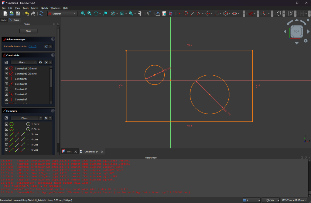 FreeCAD seems like a nice alternative – at first glance. When I tried FreeCAD, I made a simple design: A rectangle from 4 lines with 2 holes. The fact that there’s no snapping, neither to existing points nor with a modifier key to keep the lines in 45 or 90 degrees, was already a bad start. But after adding the perpendicular constrain to one corner, I was unable to add any further dimensions to the sketch. FreeCAD just kept throwing errors at me, that the value would not be valid due to some constrain. But the circle that I tried to position has no constrain at this point?