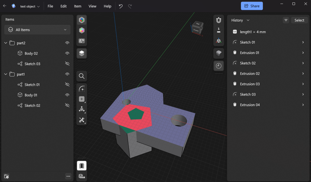 While it doesn’t offer a complex component system like Fusion, you can group sketches and bodies into folders. Sketches can use faces of existing bodies as their reference plane, and dimensions can reference other dimensions. But for some reason, you also can’t just select an existing dimension to reference it, if defining a new one… It has a timeline to go back in time, without undoing everything. It supports copying bodies and creating variants. Furthermore, it features section views to visually cut bodies and inspect it’s insides. In short Shapr3D features feel complete.