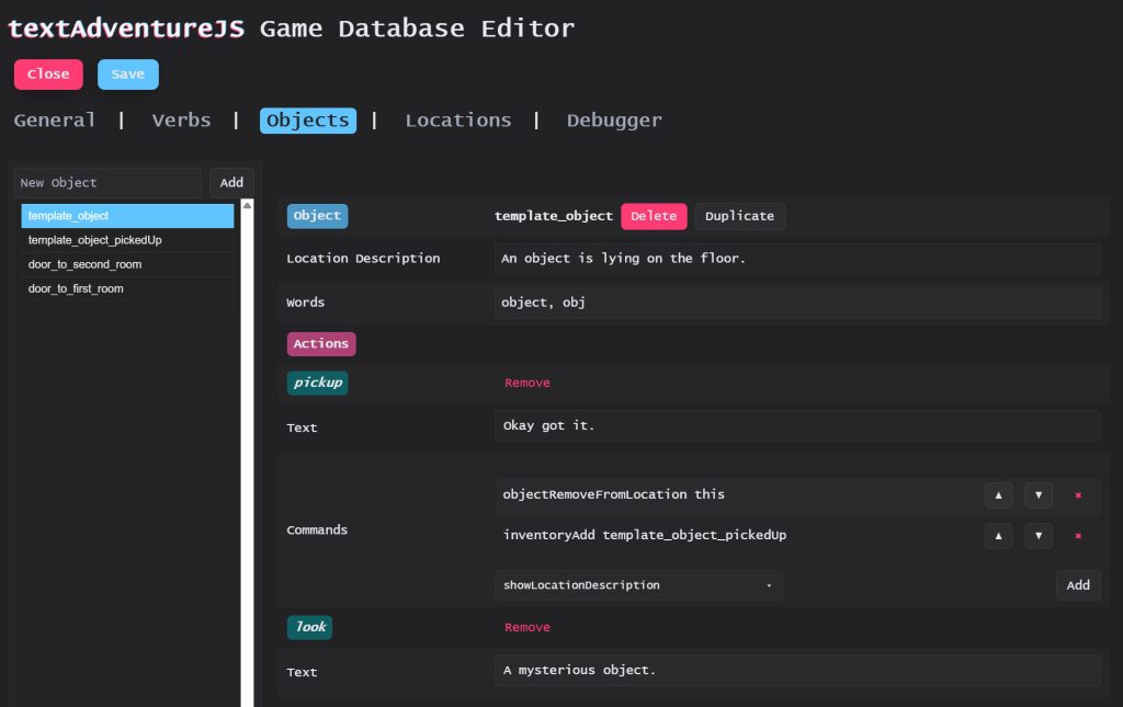 The project includes a generic player for TextAdventureGameDatabase JSON files, which also acts as an example for creating your own.